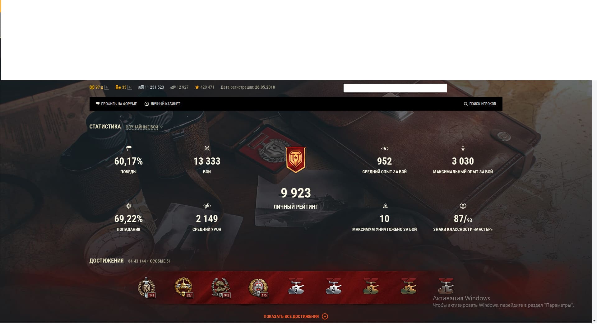 🏆Процент побед: 58% 🎌Число боёв: 17 000 💰Серебро: 415 169